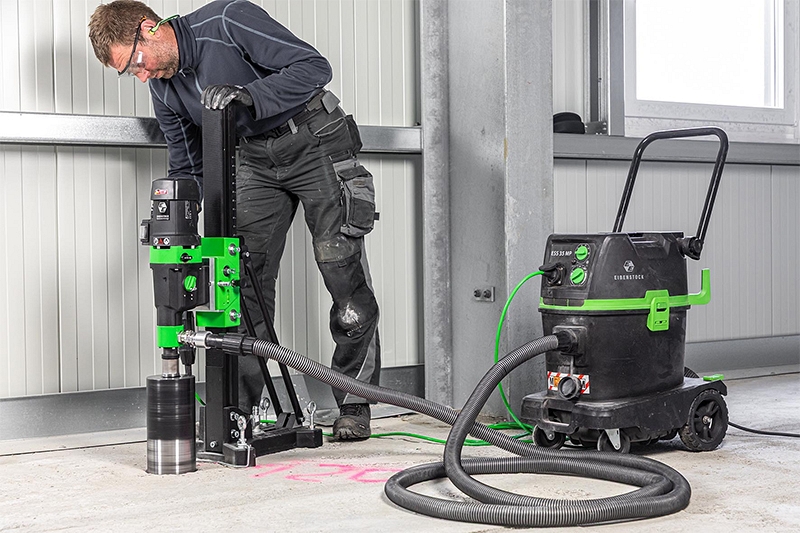 - Идеальное решение для буровых работ, где условия на площадке не позволяют использовать мокрое бурение (пустотелые потолки, предотвращение повреждения водой и т.д.)